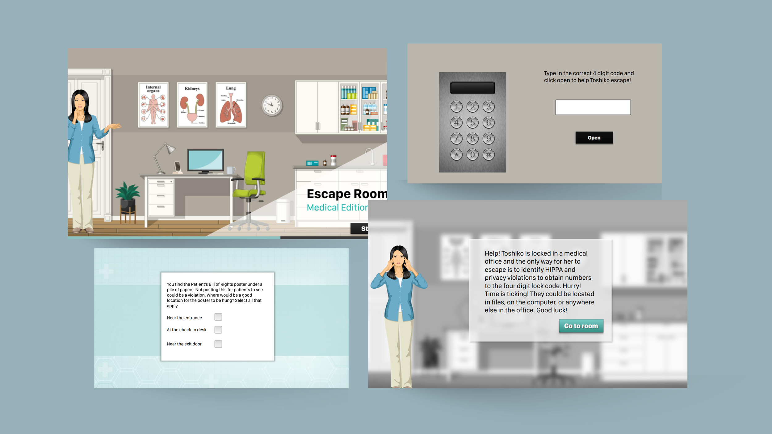 A medical escape room experience where learners explore a clinical exam room to uncover clues, answer medically based questions, and unlock each stage to progress through the activity.