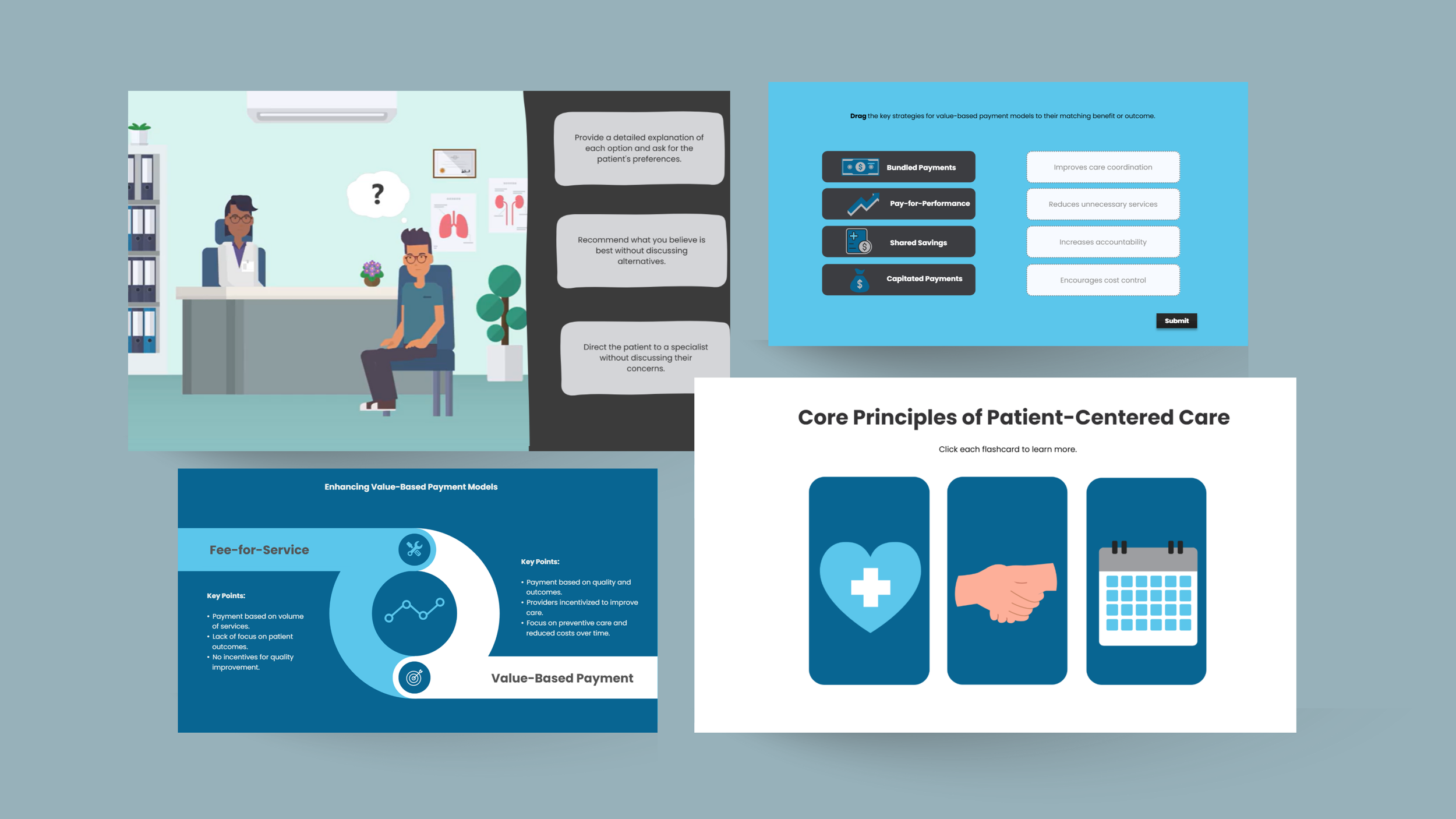 A visually elevated Articulate Rise course leveraging the newest features, complete with narrated audio, engaging visuals throughout, interactive matching activities, animated video, accordion-style interactions, and a final assessment.